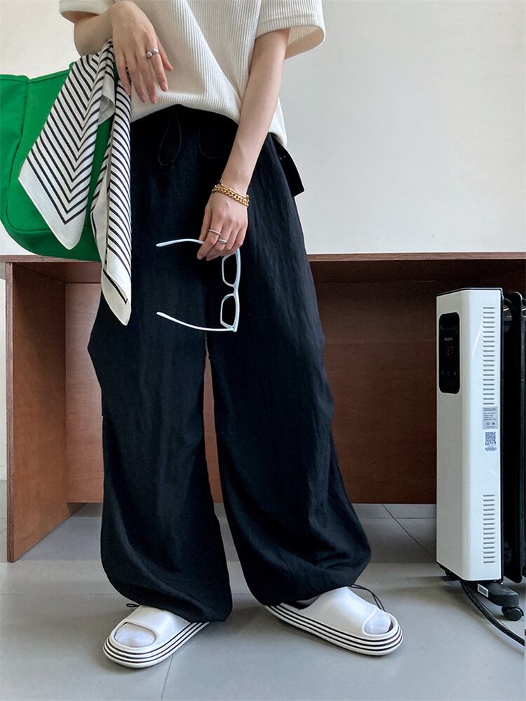 カジュアルパンツ 伸縮性のあるウエスト ハイウエスト ロングパンツ ワイドパンツ