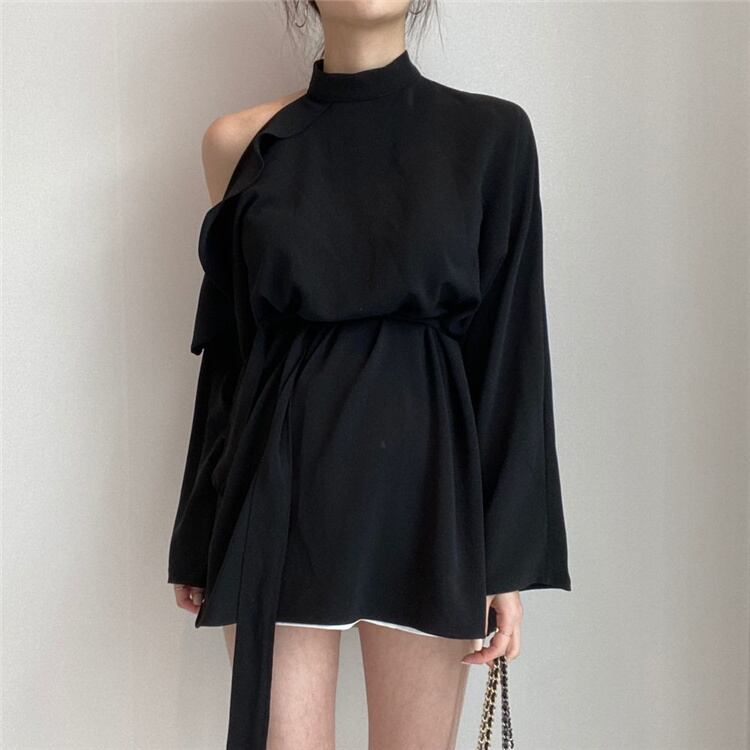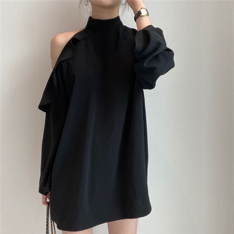 オシャレ度UP 早い者勝ち 新作 スタンドカラー オフショルダー フリル バンディング 長袖